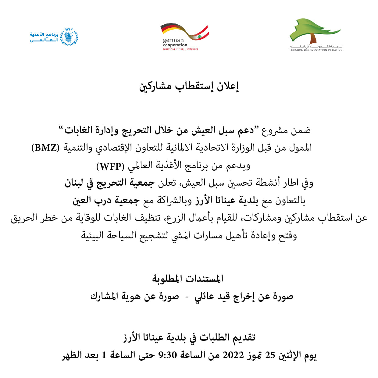 Within the project “Supporting Livelihoods through Reforestation and Forest Management” funded by the German Federal Ministry for Economic Cooperation and Development (BMZ) and with the support of the World Food Program (WFP) and within the framework of livelihood improvement activities, implemented by the Lebanon Reforestation Initiative (LRI) in cooperation with Ainata Al Arz Municipality and in partnership with Darb Al Ain Association (DAA). Participants wishing to work on this project were received at the municipality building to submit applications and obtain the necessary information for each participant.